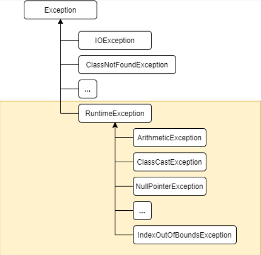 - 런타임 에러 : 메모리 부족, 스택 오버플로우 등 코드에 의해서 수습될 수 없는 심각한 오류(error)와 코드에 의해 수습될 수 있는 미약한 오류(Exception)으로 구분된다.